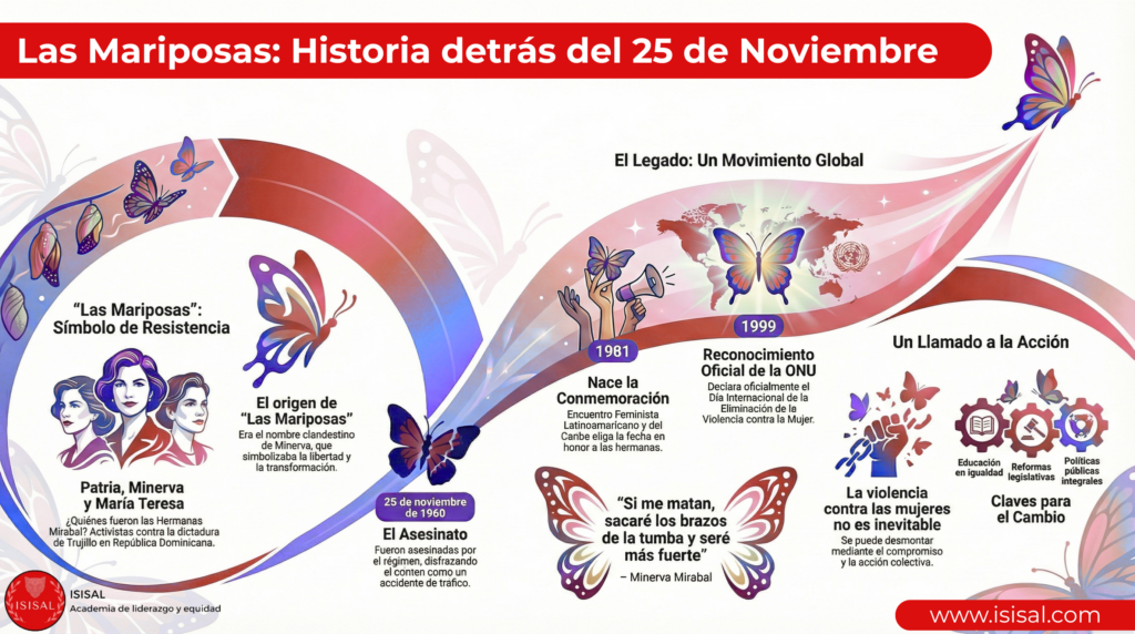 El apodo de “Las Mariposas” se ha convertido en uno de los símbolos más potentes asociados al 25 de noviembre y al Día Internacional de la Eliminación de la Violencia contra la Mujer. Este nombre surgió como alias clandestino utilizado por Minerva Mirabal dentro del movimiento opositor al régimen de Trujillo.